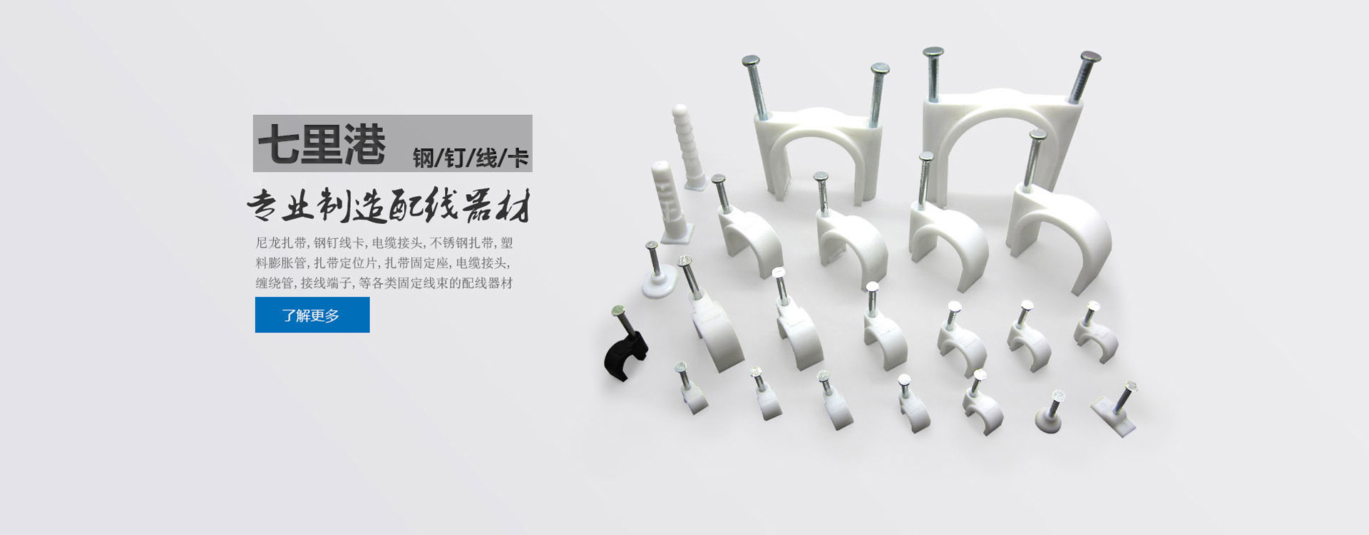 公司主要產品有:尼龍扎帶系列,鋼釘線卡系列,膨脹管系列,壓線帽系列,接線端子系列,